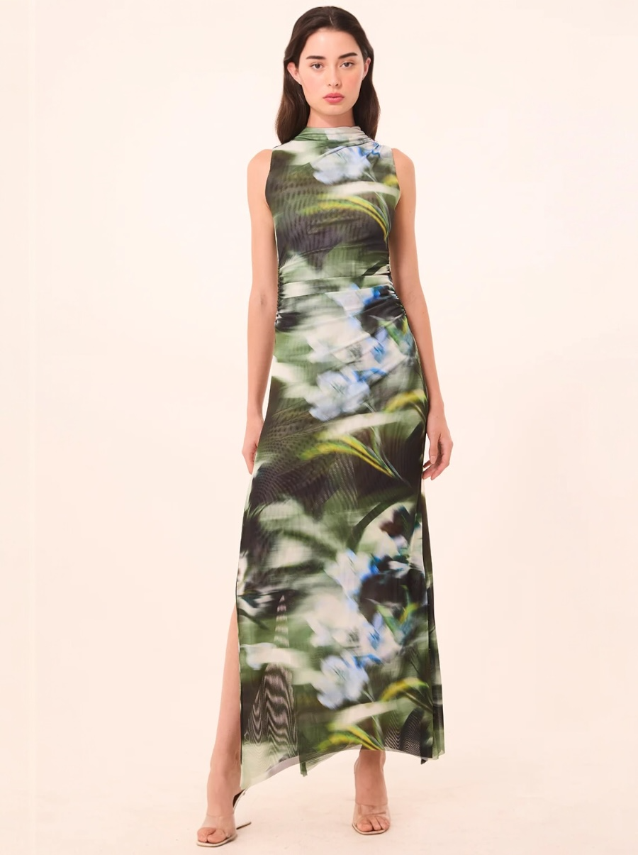 Stun this season and beyond in our best-selling Athena dress, cut from blurred Casablanca Lily printed mesh. This curve-hugging maxi silhouette features a high neckline and flattering waist ruching. Designed as an effortless pullover style with button details at the shoulder, it pairs beautifully with strappy heels for your next event.