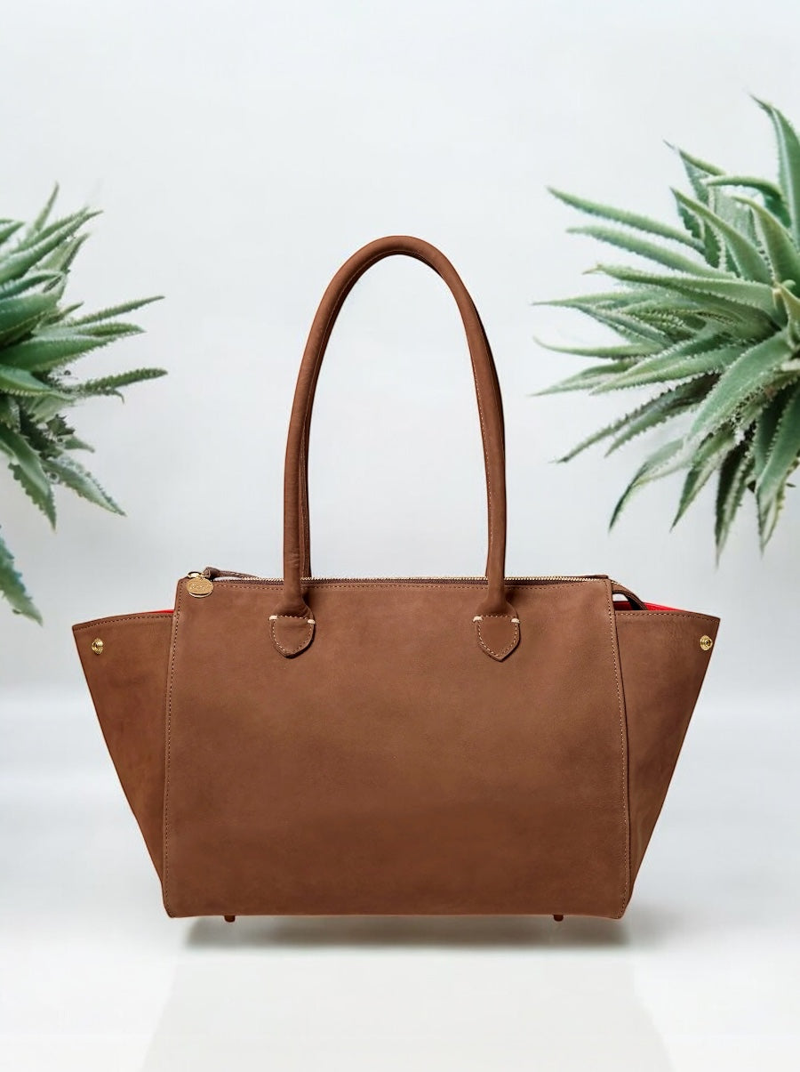 Beatrice means business. With her laptop-ready capacity, brass feet and adjustable silhouette. Via snappable side panels. Made of Italian nubuck leather.