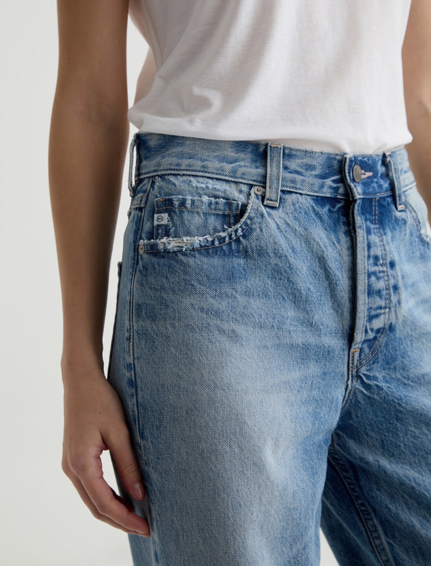 Crafted in Sioux Rigid Denim from the renowned Candiani Mill in Italy, Billie is your relaxed straight jean designed to sit low on the hip for an effortlessly cool look. A roomy top block, button fly closure, and spacious leg offer comfort without compromising style, making Billie your go-to for everyday ease. Designed in our faded medium-blue wash, Sierra Meadow, and finished with whiskering, fading, and distressed trim and raw hem.
