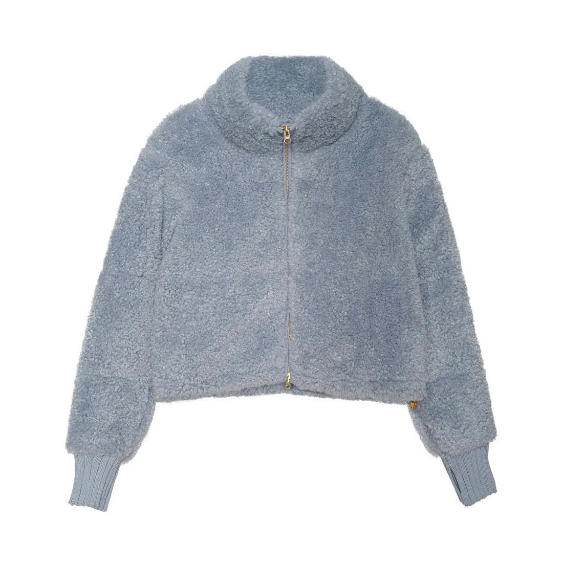 The Bobbi Jacket is a slate blue sherpa jacket designed for cozy ease. Finished with sweater rib cuffs, a zip-front closure, it features functional side-seam pockets. Slightly cropped, it falls right at the waist on most wearers. Designed with a high stand collar for added warmth, it’s finished with adjustable side drawstrings that let you cinch the waist for shape or leave relaxed for a boxier fit.