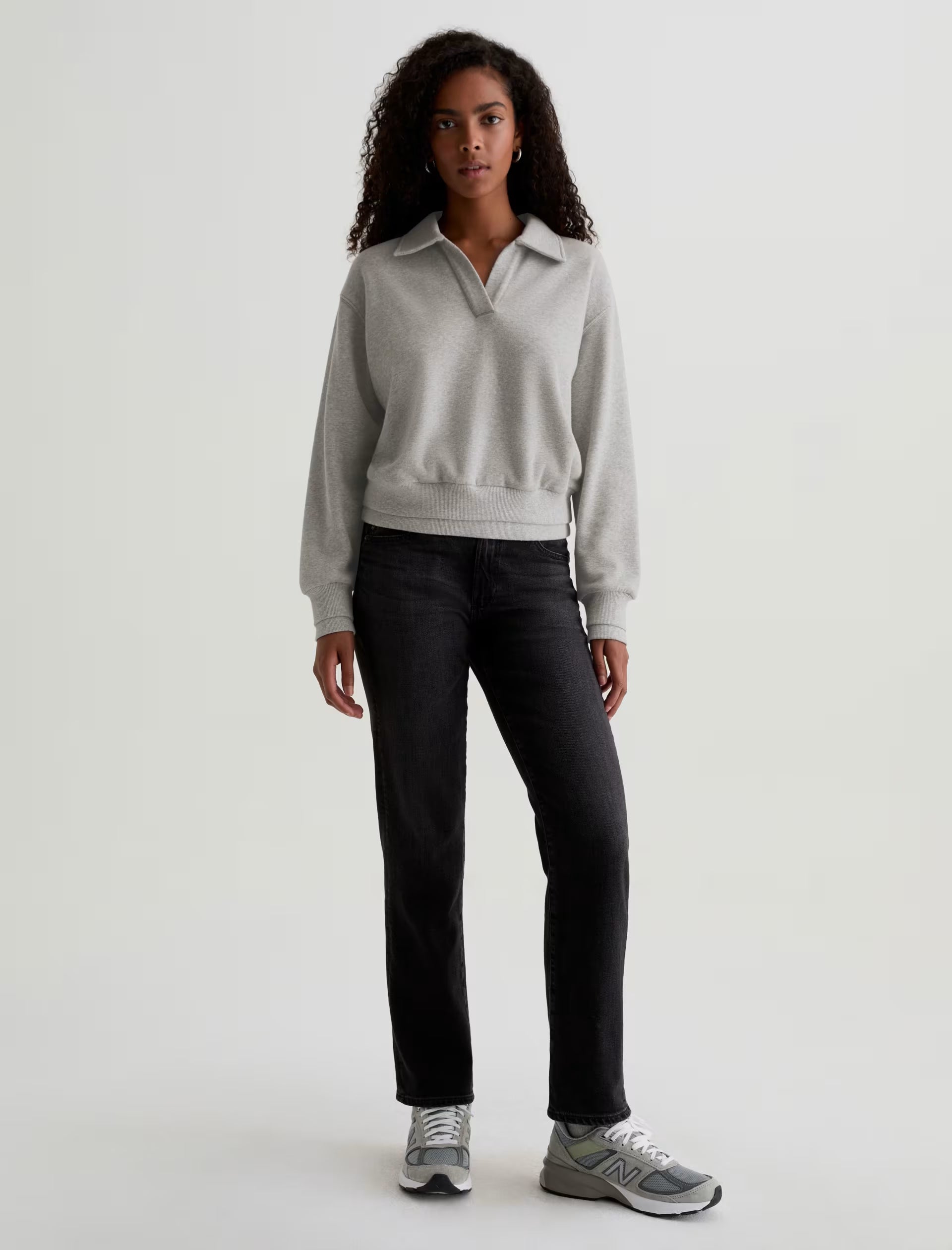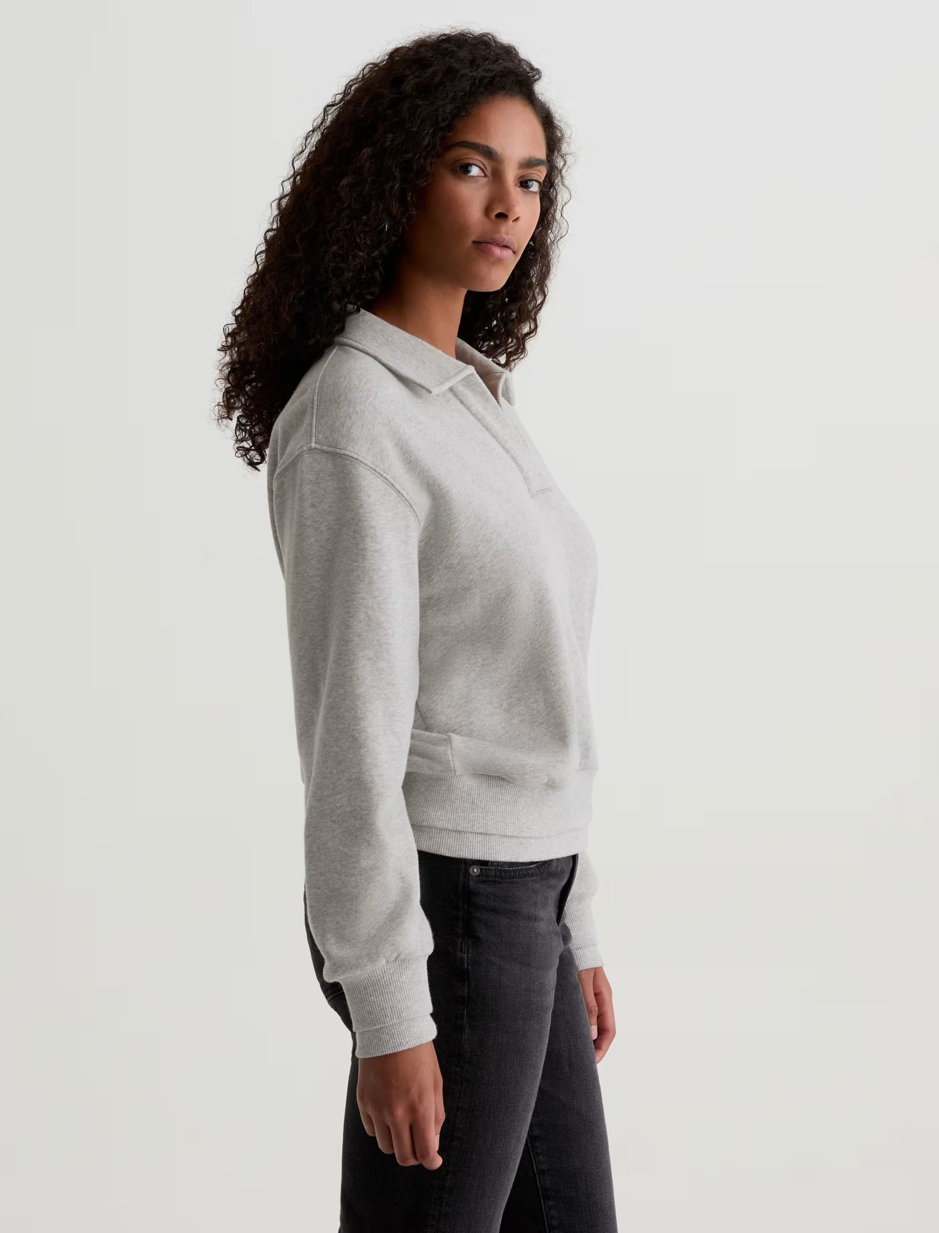 The Carol is a sweatshirt crafted from soft sherpa fleece in heather grey. Detailed with a Johnny collar, dropped sleeves, and dual trim. An easy-to-style, more elevated classic.