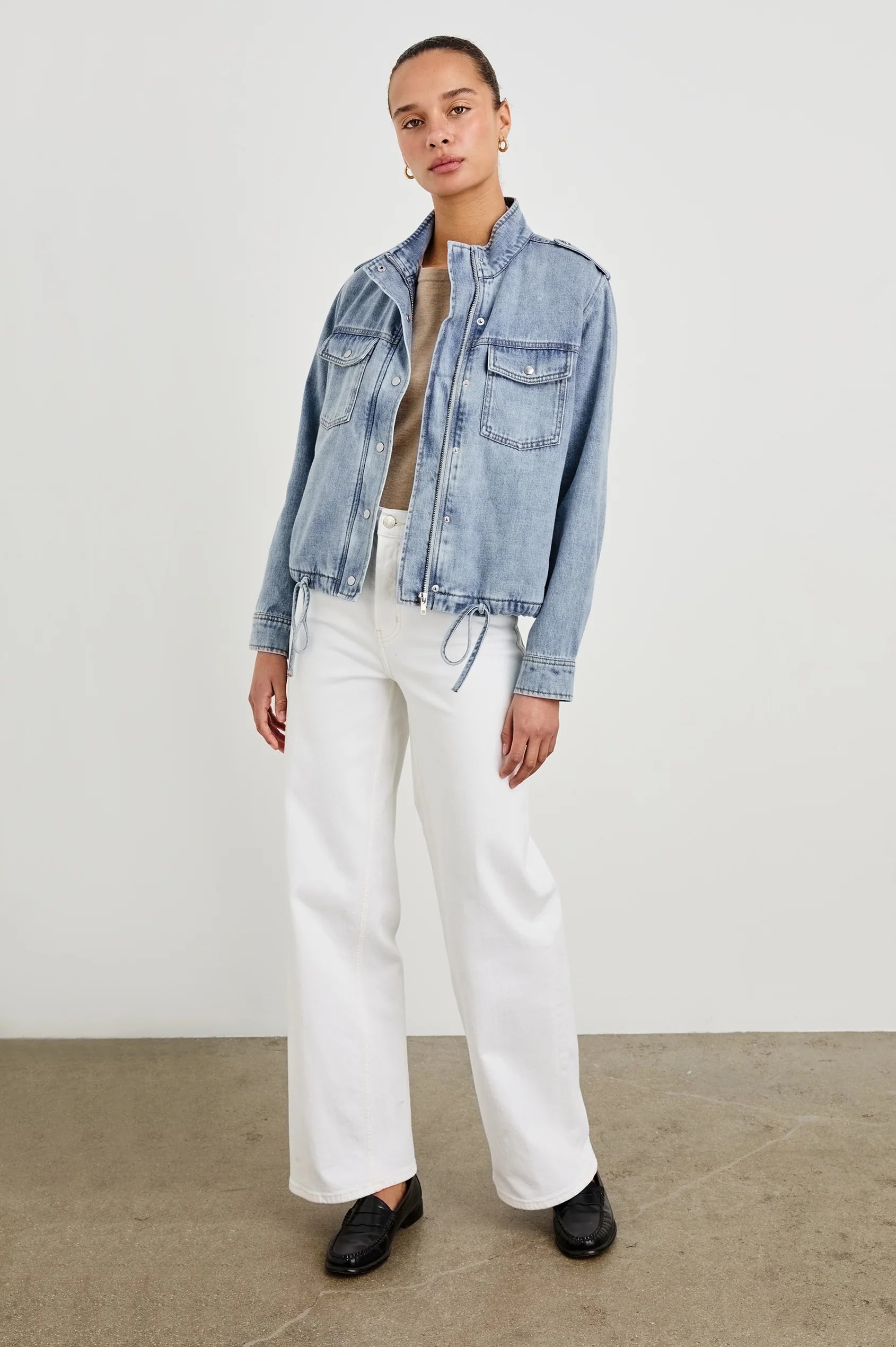 The Collins Jacket is a military-inspired jacket crafted from 100% double gauze cotton. It features a toggle-drawstring hem, shoulder epaulets, cargo chest pockets, and a breathable back flap.