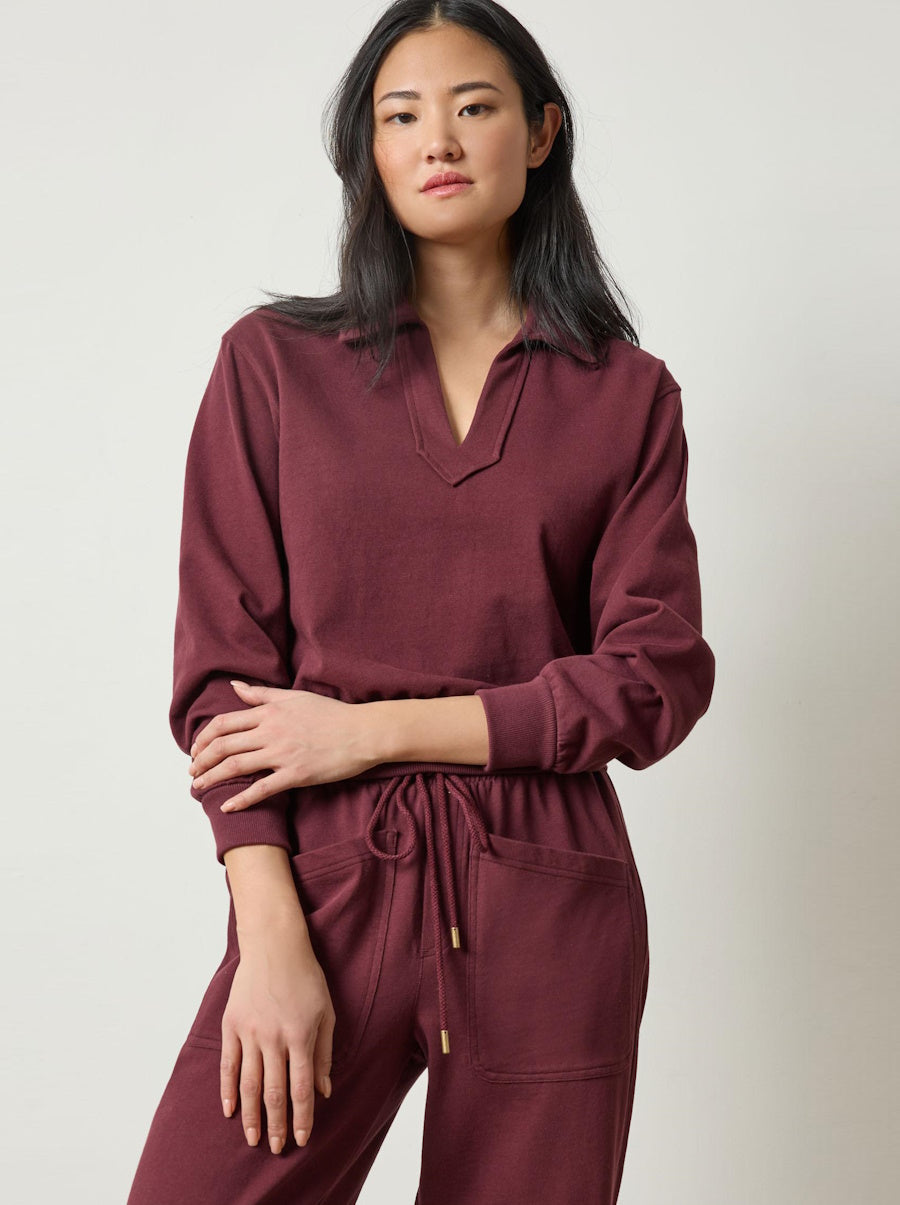 Stay cozy and stylish in this drop shoulder polo sweatshirt, crafted from soft burgundy cotton-blend fleece. Featuring a relaxed fit, ribbed hem and cuffs, and a deep V-collar, this pullover brings effortless cool to your off-duty days. Perfect for pairing with matching joggers or denim.
