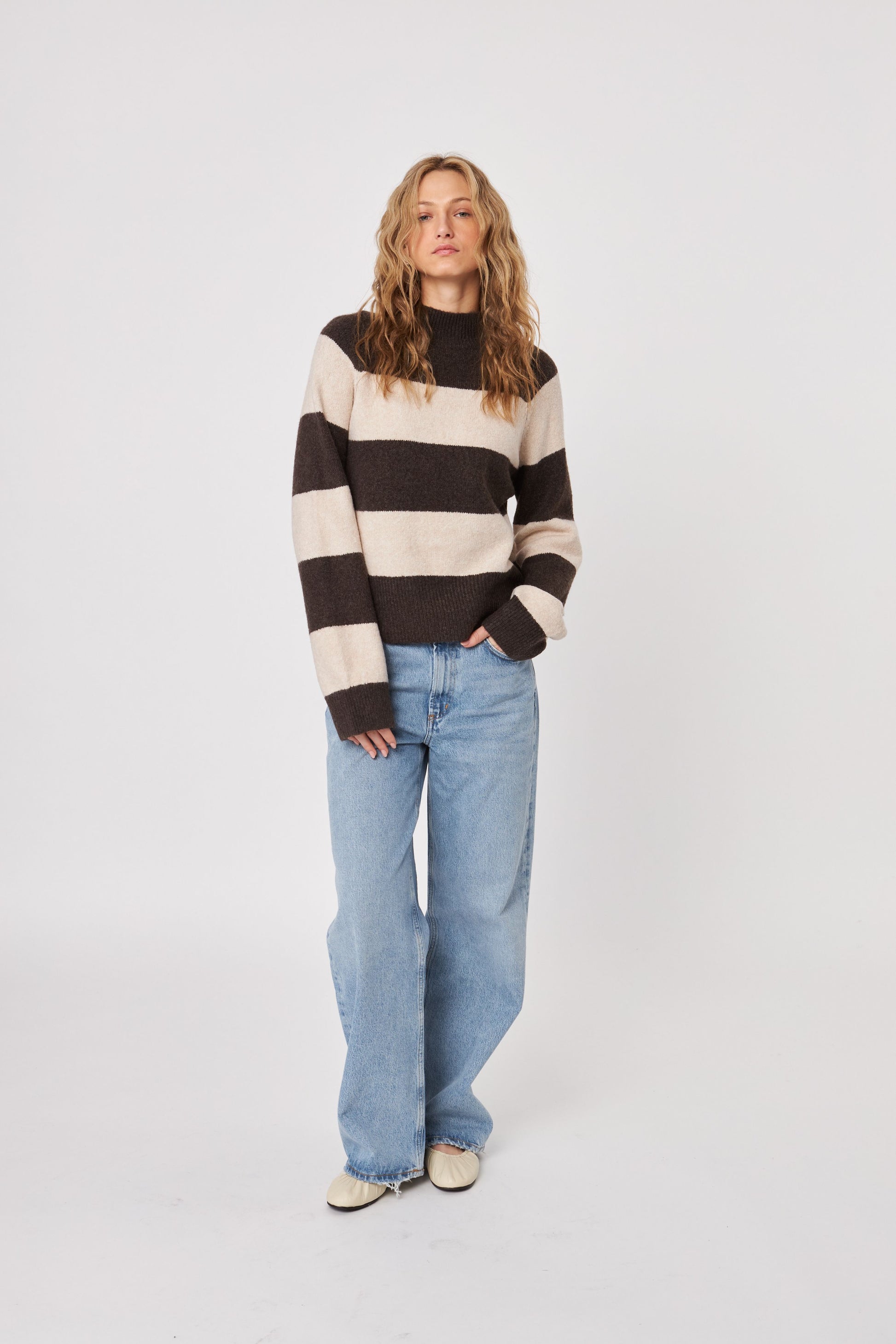 Designed with oversized horizontal stripes in rich chocolate brown and soft beige, this relaxed-fit sweater features a high mock neckline and ribbed finishes for a structured yet slouchy silhouette. A standout layer for transitional days.
