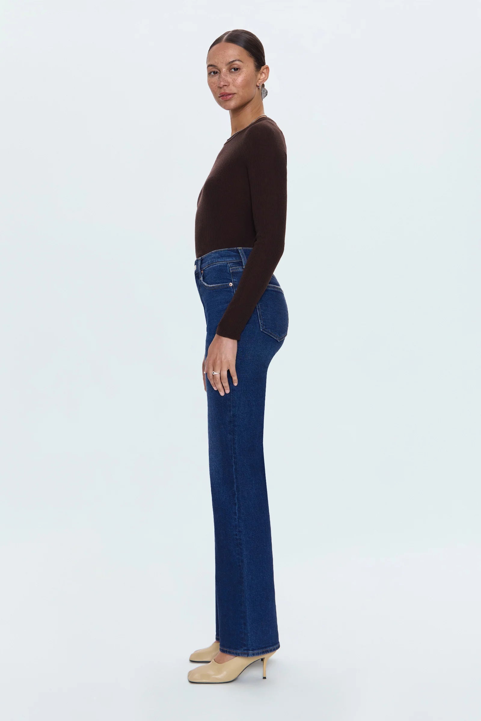 The slim boot that flatters every frame. Evie sits at a high rise with a slim fit through the hips and thighs before opening to a subtle bootcut, creating long, lean lines with just the right amount of flare. The full-length 33" inseam elongates the silhouette, making it endlessly versatile for heels or boots. Crafted from comfort stretch denim in Penthouse, a dark indigo wash with refined fading that adds depth and sophistication.
