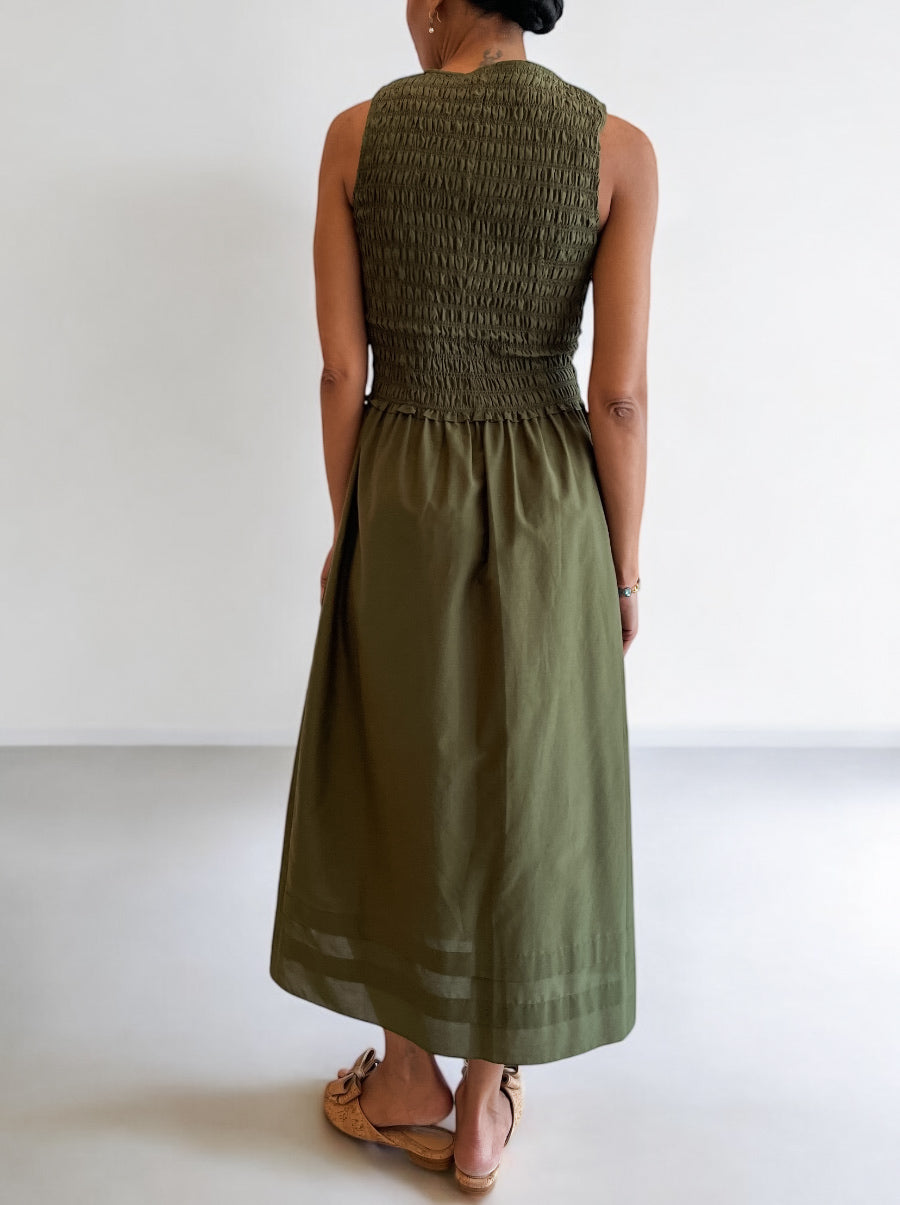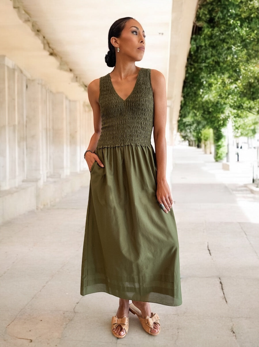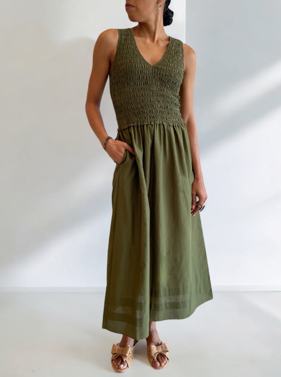 This sleeveless midi dress features a smocked bodice with a flattering V-neckline and a softly gathered skirt for elegant ease. Crafted from lightweight cotton, it offers a breathable fit with hidden side pockets for added function. Perfect for both casual days and dressed-up evenings with simple accessories.