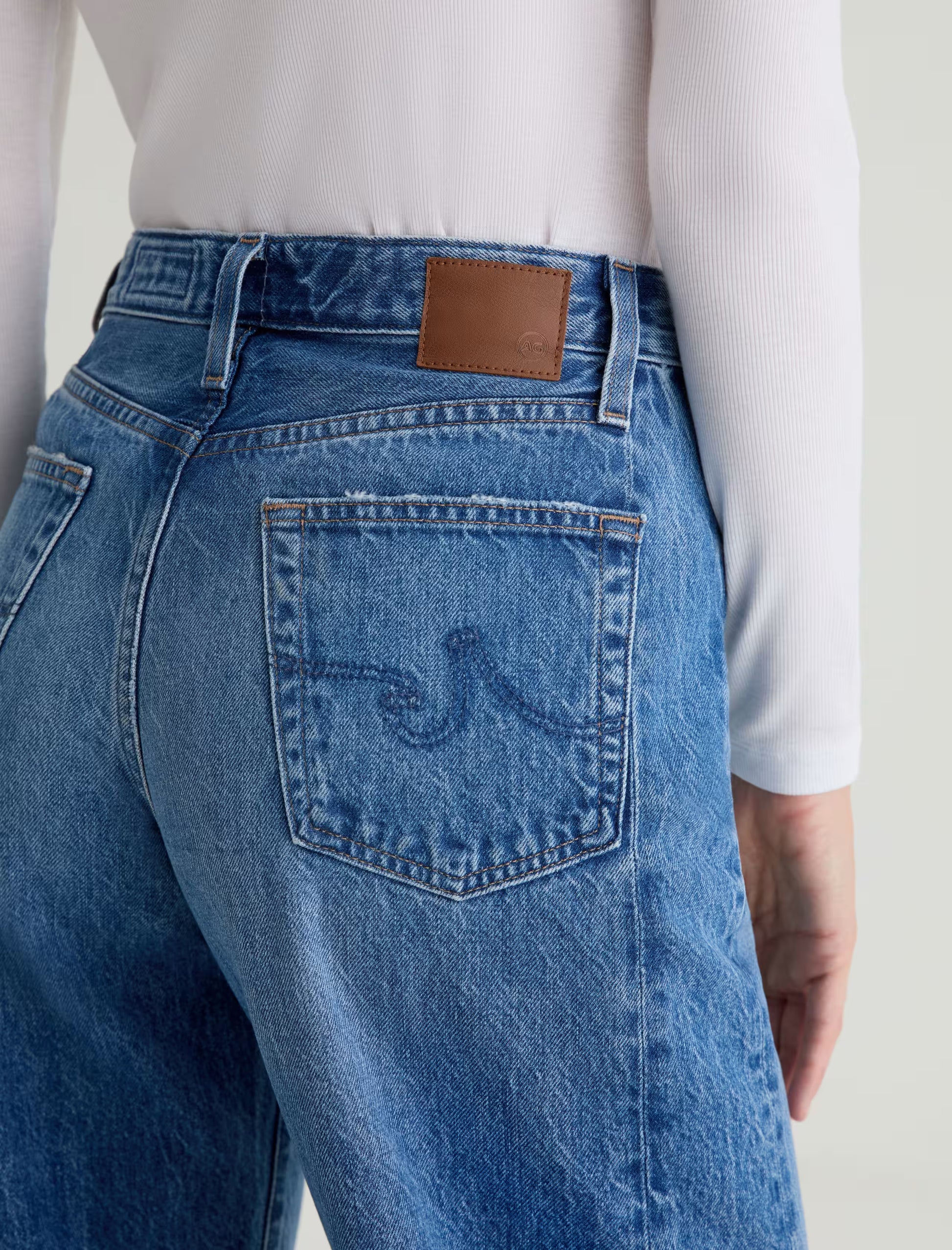 Hattie is a fashion-forward barrel leg with a high rise and a subtle curved silhouette, defined by side seam paneling. Cropped at the ankle with a wide opening, it's crafted from 13 oz. Sioux Rigid Denim. Designed with classic five-pocket styling and premium construction for everyday wear. Shown here in candid.