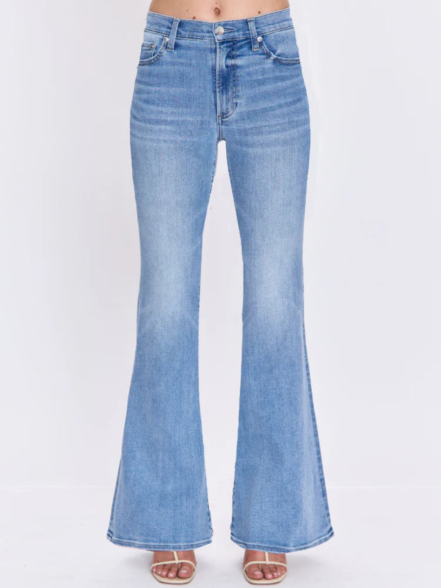 Make a statement with Kinsley's bold silhouette. This mid-rise flare jean features a generous, sweeping leg that flows from knee to hem, delivering timeless retro flair with contemporary ease. The full 32 1/2" inseam ensures floor-grazing length and unrestricted movement, while the stretch denim in Captivate classic med to light indigo wash offers all-day comfort without sacrificing style. Vintage-inspired proportions meet modern wearability in this show-stopping essential.