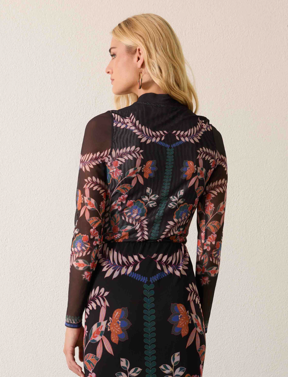 A sheer black mesh top featuring long sleeves and a colorful floral print. Designed with a mock neck and lightweight stretch for a flattering fit. Perfect for layering or styling on its own for a statement look.