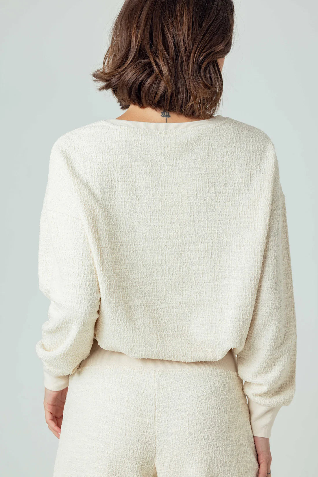 Made in our knit boucle fabric that is lightwieght with Textured comfort. Meet: Miri. It features an adjustable elasticized hem, allowing for versatile styling, and a slightly open crew neckline that beautifully frames necklaces. Billowy long sleeves add subtle volume, while the relaxed fit through the body ensures ease (sizing down offers a more fitted look) Slightly cropped, it’s designed to sit at your natural waist, making it perfect with high-waisted favorites. Shown styled with the Filia Skirt and Audelia Pants.