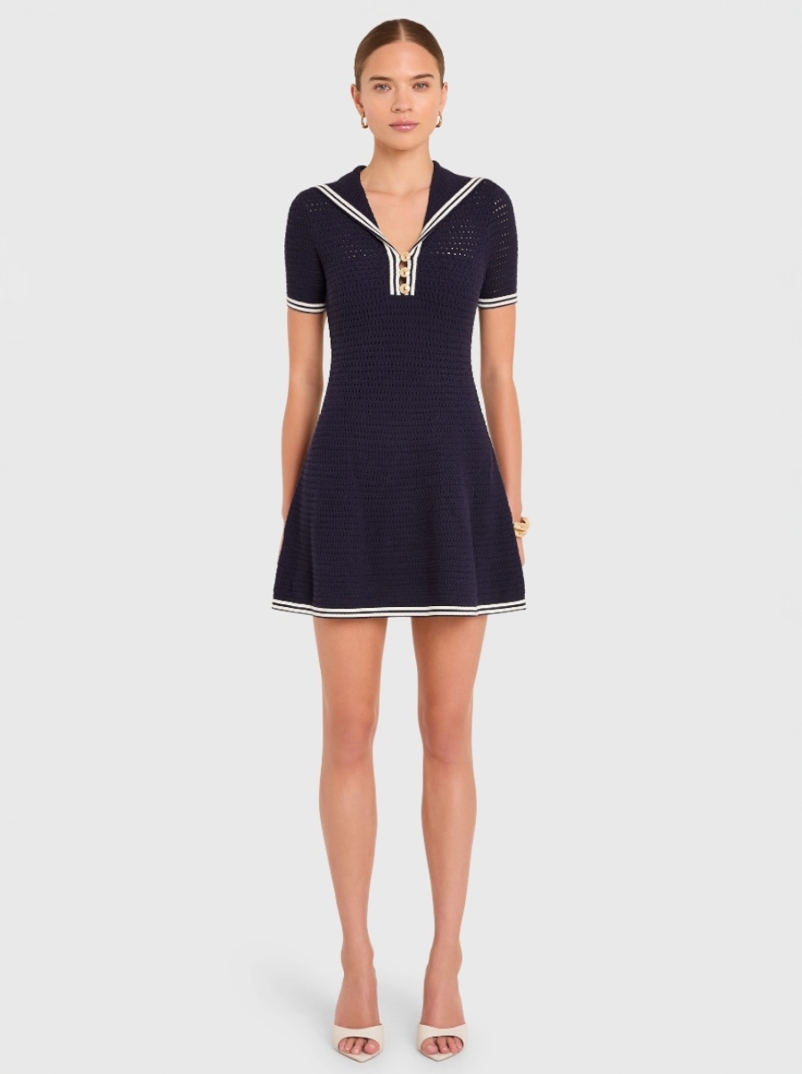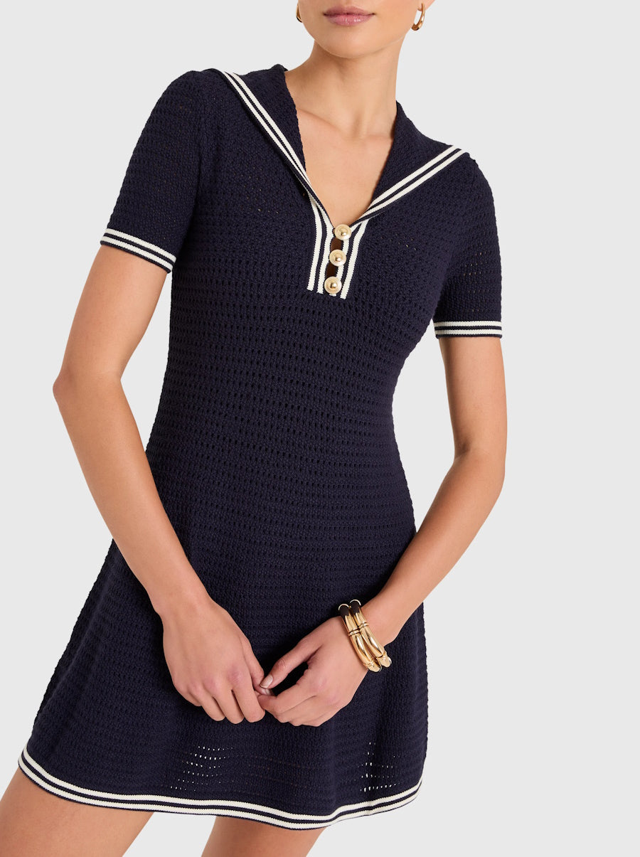 Keep things classic in the Monique Dress. This knit mini features a flattering V neckline and gold buttons for the perfect touch of shine. Pair with ballet flats and minimalist jewelry for a polished, nautical look.
