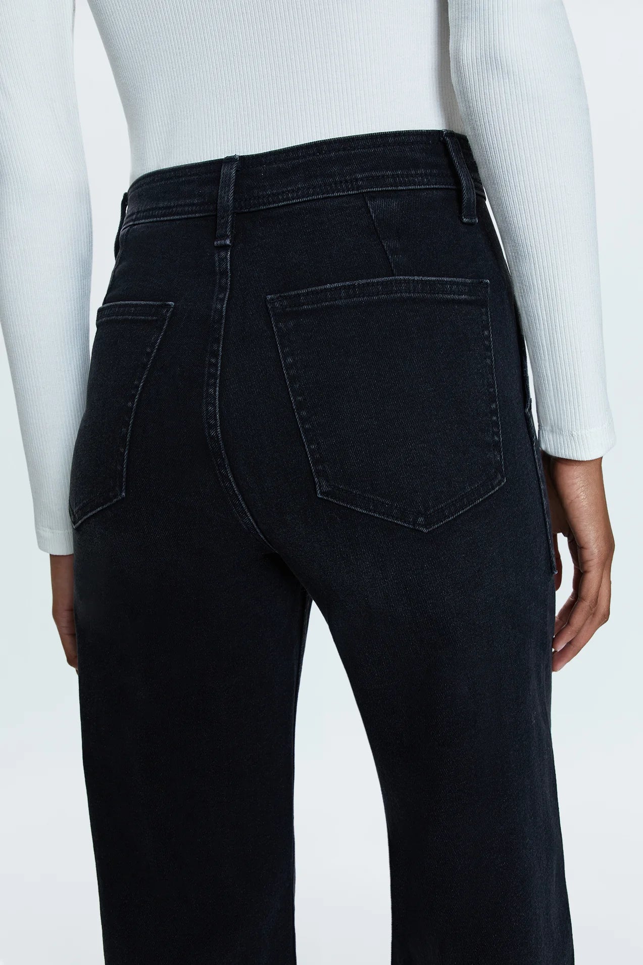 The wide leg that changes everything. Penny sits at a high rise with an ultra wide leg silhouette and full-length 32" inseam. Designed with no side seams for a clean, seamless silhouette that flows beautifully. The relaxed wide leg moves with intention while the high rise anchors the proportions perfectly. Utility-inspired details add functional appeal to the contemporary silhouette. Crafted from our comfort stretch denim in Collins, a rich black wash.