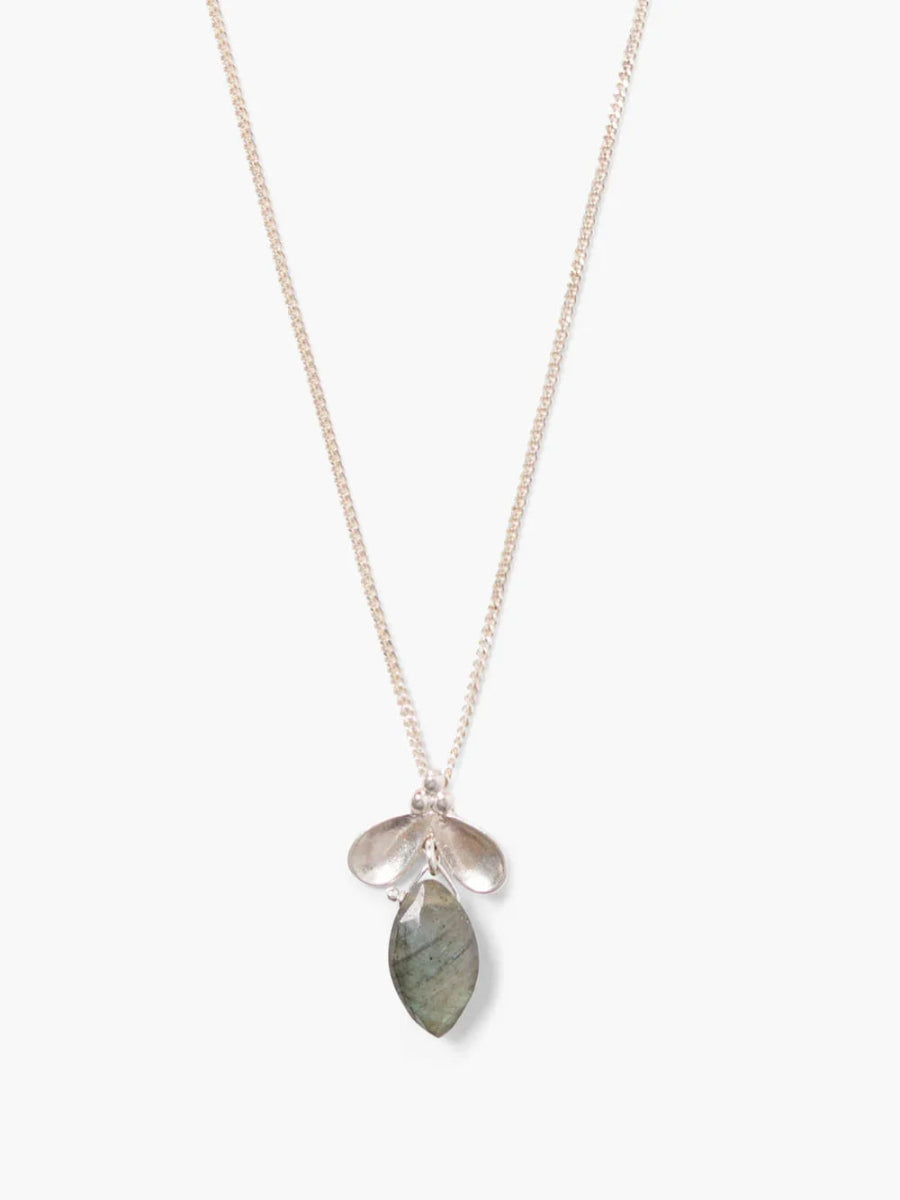 This delicate pendant necklace features a labradorite marquise suspended between two silver petals. Finished on a silver chain, it can be adjusted to create your ideal fit.
