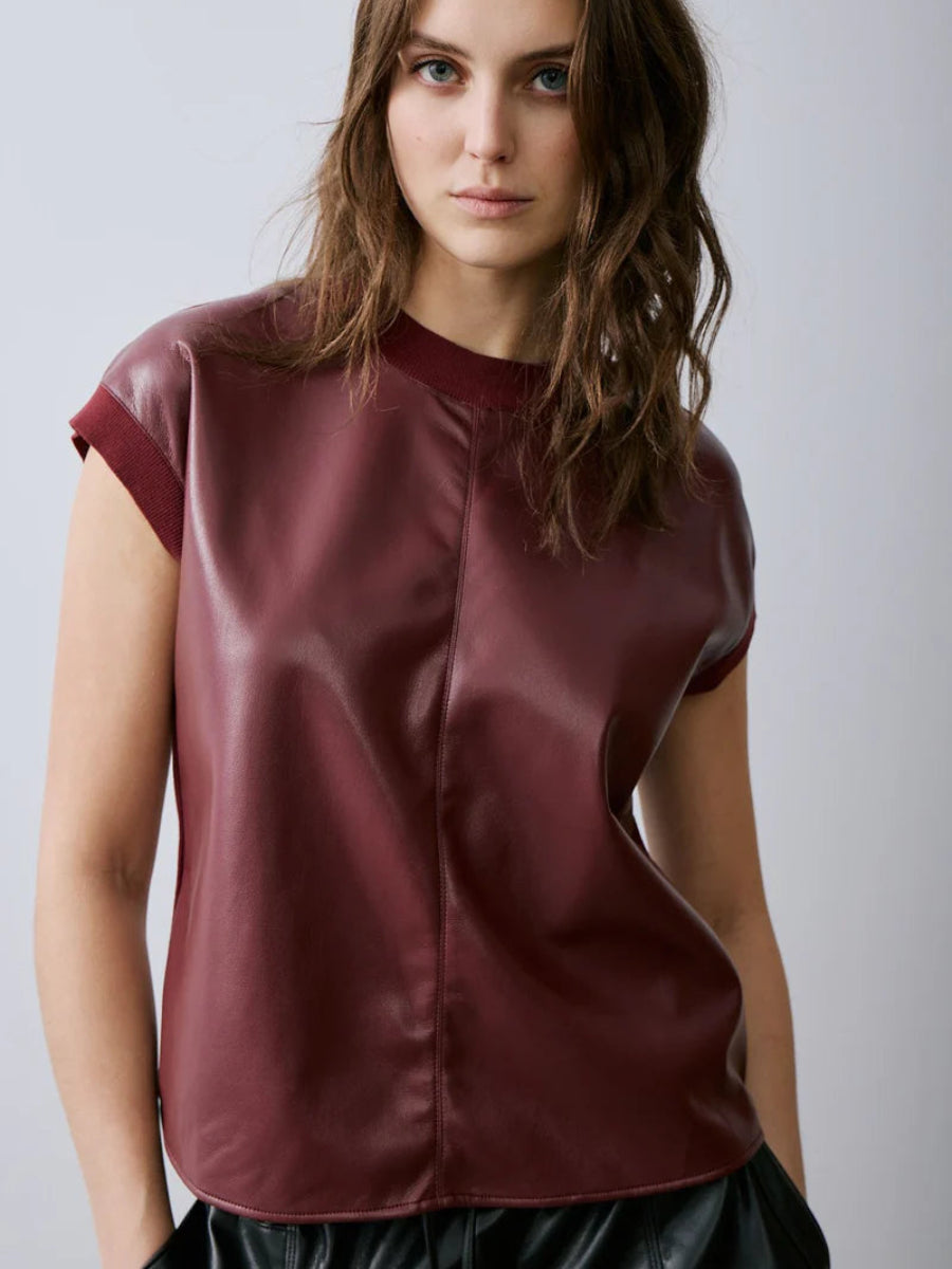 Chic and modern, this faux leather top features a relaxed muscle-tee silhouette with a smooth, structured finish. Perfect for elevating everyday looks, it pairs effortlessly with denim or tailored bottoms for a polished edge.