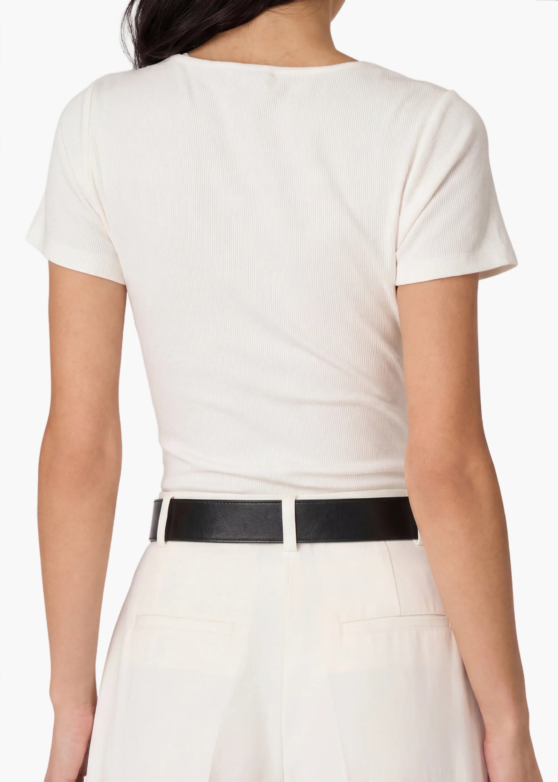 A modern essential with effortless style, the Sana Rib Knit Tee in white blends everyday ease with refined detail. Crafted from an ultra-stretch rib knit that skims the body, it features a flattering V-neckline and short sleeves for a clean, versatile silhouette. Subtle applied trim along the neckline adds a quietly elevated touch that feels both minimal and elegant.
