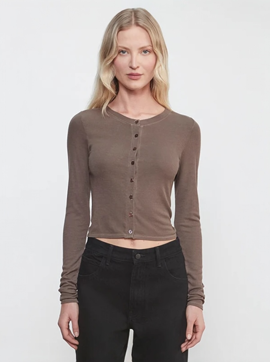 The Essential Cardigan is cut from our signature silk blend rib, with a slim fit and flattering stretch. Waist length with signature center back seam, and shell button placket.