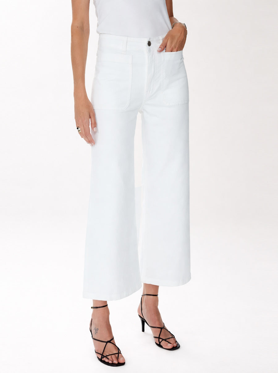 Zooey updates the classic utility pant with a high rise, streamlined straight leg, and cropped inseam that gives the silhouette a contemporary new feel while patch pockets offer practical appeal. Crafted in Le Blanc, the bright white wash adds a polished contrast to the pant’s workwear roots.